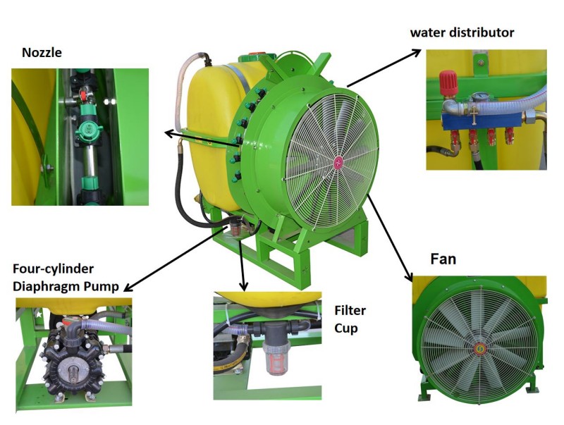 Khi máy kéo điều khiển bơm chất lỏng hoạt động, nước trong hộp thuốc đi vào bơm chất lỏng qua đầu, công tắc và lọc nước. Sau đó, nó đi vào hộp thuốc lỏng thông qua ống trở lại và đường ống khuấy của công tắc chính của tủ phân phối điều chỉnh áp lực. Trong khi thêm nước vào hộp thuốc, thuốc trừ sâu được thêm vào hộp thuốc theo tỷ lệ cần thiết, để thuốc trừ sâu được trộn trong khi thêm nước. Trong quá trình phun, thuốc lỏng trong hộp thuốc đi vào bơm chất lỏng qua ống đầu ra, bộ lọc và ống nước đầu vào của bơm lỏng. Theo tác động của máy bơm, thuốc lỏng đi vào công tắc chính của van phân phối điều chỉnh áp suất từ ống đầu ra của máy bơm. Khi công tắc chính được bật, một phần của thuốc lỏng đi vào vòi phun của thiết bị phun qua ống phân phối thuốc thông qua hai công tắc riêng biệt. Các loại thuốc lỏng áp lực xâm nhập vào vòi phun được phun ra trong một màn sương dưới tác dụng của vòi phun, và các giọt nước được nguyên tử hóa lại thông qua luồng không khí mạnh do quạt tạo ra. Đồng thời, các giọt tốt nguyên tử được thổi vào tán cây của cây ăn quả.